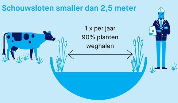 Let op, ook sloten in het uitvoeringsprogramma behouden hun functie voor berging en aan- en afvoer. Verlanding is niet toegestaan. Indien nodig moeten de sloten worden geschoond om verruiging en ecologische achteruitgang te voorkomen. Dit onderhoud kan gefaseerd worden uitgevoerd. De AGV schouwregels vindt u hier.